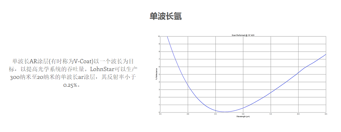 LohnStar抗反射涂层、增透膜、超低吸收(ULA) AR涂层、AR涂层 LohnStar公司于1997年开始为二氧化碳激光应用制作增透膜。我们继续提供用于10.6米波长的世界级抗反射涂层,但我们也在针对各种基底材料的完全定制的抗反射涂层中找到了一席之地。我们拥有在所有常见衬底材料(如ZnSe、Si、FuSi和Ge)以及大多数不常见材料(如GaSb、InP和金刚石)上制造AR涂层的经验。我们可以制造的AR涂层范围从200纳米到50纳米。我们还提供超低吸收(ULA) AR涂层。