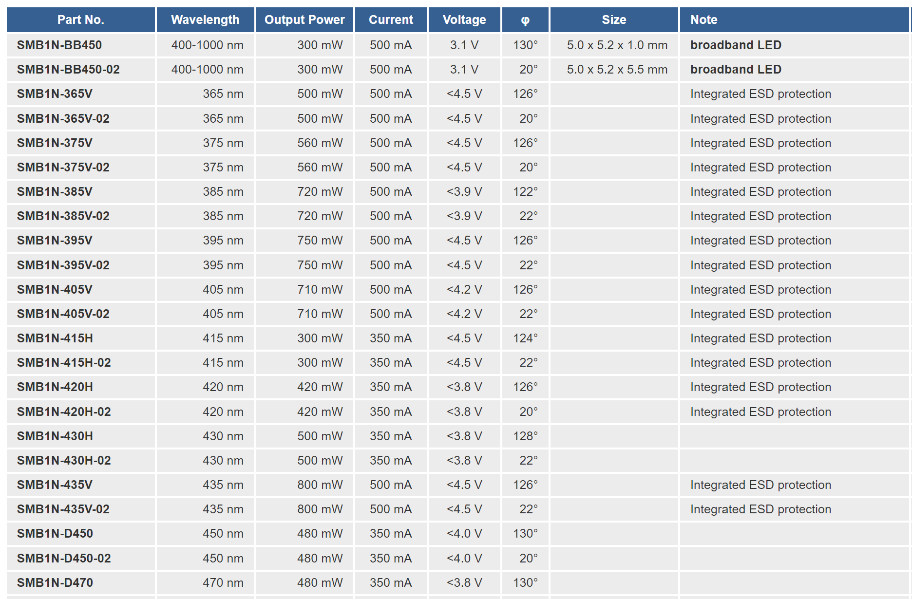 奥地利,Roithner Lasertechnik,SMB1N系列,SMB1N-BB450-02,大功率LED二极管 SMB1N系列 大功率LED,电源芯片技术 芯片尺寸为1 x 1 mm²,安装在耐热聚酰胺(PA9T) SMD封装的铜散热器上,无引线 底座尺寸:5.0 x 5.0 mm 硅胶/环氧树脂模具,平面或透镜 波长:365 nm - 1550 nm可选 -宽带大功率Led -300 mw @400 - 1000 nm -InGaN芯片,1000x1000um -PA9T SMD封装(5.0 × 5..2X5.5mm) -视角:20° 描述: SMB1N-BB450-02是一款基于表面贴装InGaN的大功率宽带LED,其典型峰值波长为450 nm,宽带发射波长为400 nm至1000 nm。它采用SMD封装(PA9T),镀银焊垫(无铅可焊),铜散热器和硅树脂模制镜片 最大额定值: