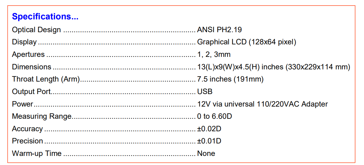 Tobias TBX1000™ 与 TBX1500™ 透射密度计规格: