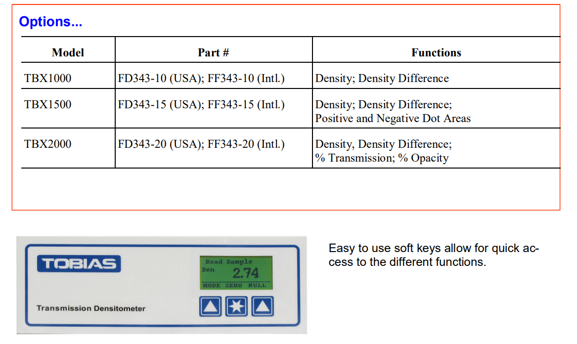 Tobias TBX1000与 TBX1500 透射密度计主要特性: