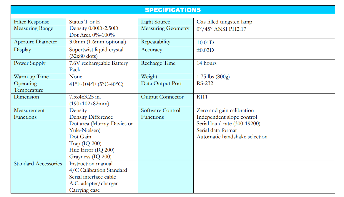 Tobias Associates, Inc. IQ150/IQ200密度计规格: