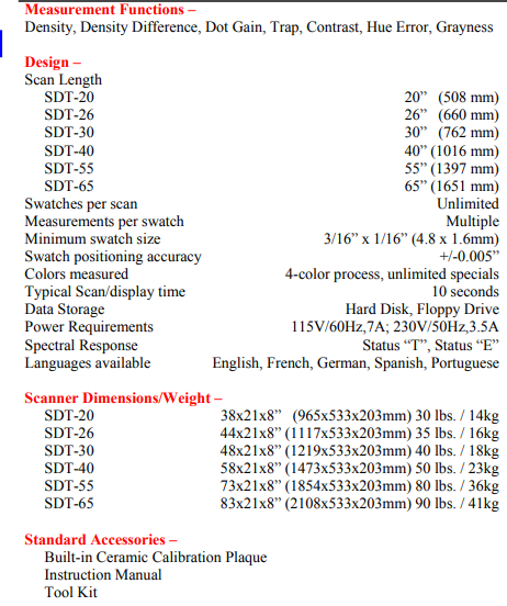 Tobias Associates SDT-20扫描密度计规格: