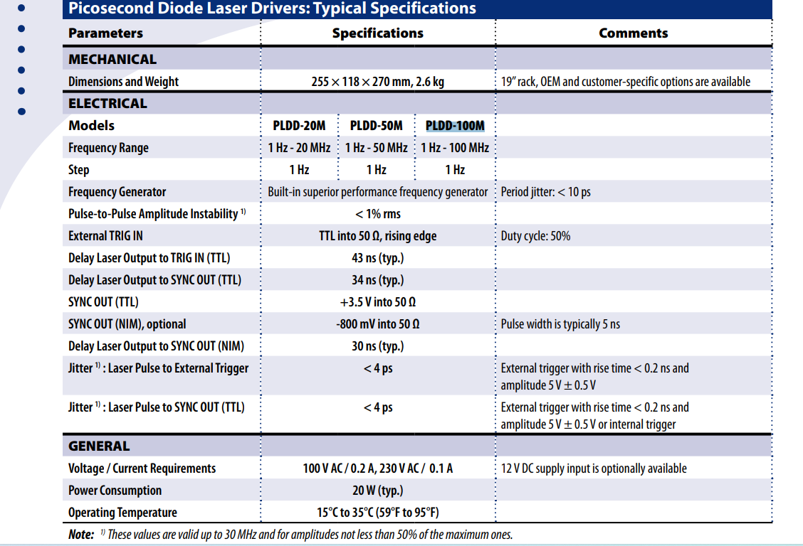 ALPHALAS PLD系列皮秒二极管驱动器规格: