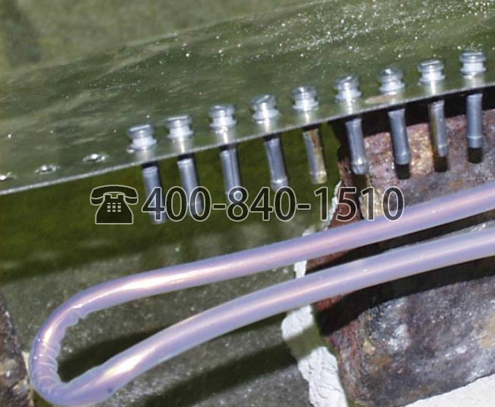 单匝通道线圈用于此应用。螺纹销放置在中心到中心相距 0.5 英寸(12.7 毫米)的不锈钢板上。以每小时8000个零件的速度将20个销加热10秒以达到375 ºF(190.5ºC)。