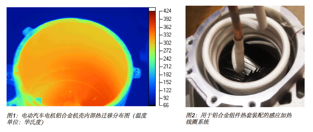 在加热过程中,铝制机座受热膨胀,为定子装入创造充足装配间隙。通常采用内径式感应线圈进行加热,虽然其效率不及外径线圈,但通过最小化线圈与铝材表面间距(气隙越小加热越快,所需电源功率越低)可优化能效。当铝合金机壳壁面带有冷却流道时(这类设计通常用于维持系统工作温度),同样不推荐采用外径线圈方案。