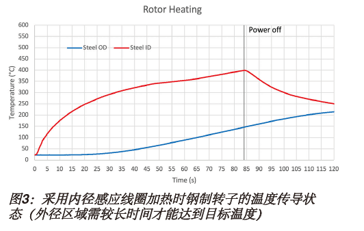 在某些应用场景中,采用外径线圈对钢制转子总成进行加热是更为可行的方案。这种加热方式能实现感应加热系统的最大能效,且感应线圈的制造与维护更为简便。外径与内径之间的温度差主要取决于金属基体的导热性能。以钢这种首选材料为例,其导热特性会限制热量向中心传递的速度