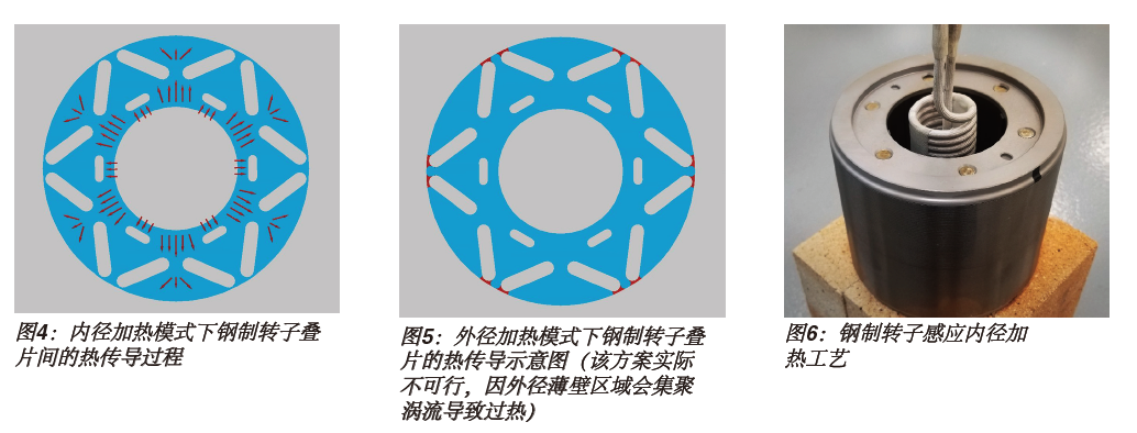 钢质转子总成的感应加热存在两种方案:外径线圈加热与内径线圈加热。鉴于感应热效应仅局限于线圈表面数毫米范围内,外径加热方案会导致磁钢间隙与圆周区域的薄壁部位过热,故不推荐采用。若为避免过热而采用缓慢加热,又会大幅延长工艺时间,导致能量输入不足,使得感应加热工艺失去实用性。