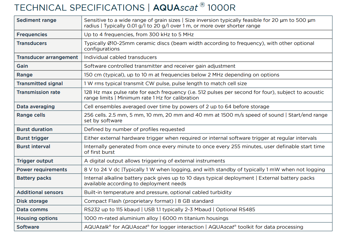 Aquatec AQUAscat 1000R Deep 型号采用钛合金外壳,可承受高达6,000米的深海压力。该设备专为深海悬沙监测设计,作为旗舰科研型号的专业衍生版本,配备四个有线传感器,提供2.5毫米至4厘米的可调分辨率。设备同时集成温度与压力传感模块。通过搭载深海专用电池方案,该设备可在无外部供电环境下实现长期布放,确保在偏远海域持续稳定运行。