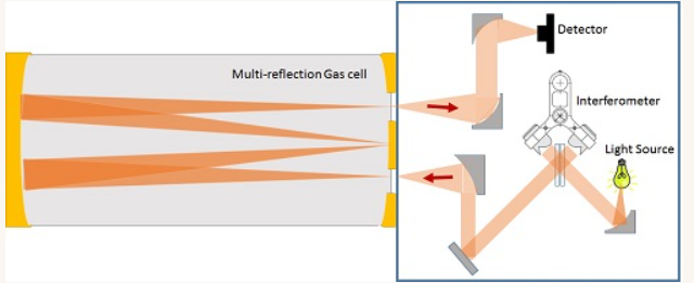 Gasex系统由一个包含MCT探测器和红外光源的干涉仪模块,以及一个多次反射气体池组成。光线由黑体辐射模块产生,并通过双角锥棱镜干涉仪进行调制。随后,光被耦合进入气体池(待分析气体被注入其中),并在池内经过 32 次来回反射。最后,光线被聚焦到 MCT 探测器上。