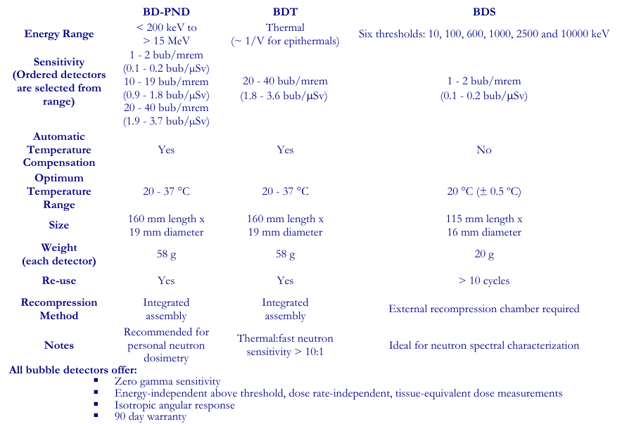 气泡检测器是市面上最灵敏、最准确的中子剂量计。气泡探测器被核设施、研究机构、军事人员和医学界使用超过 35 年,可提供即时可见的中子剂量检测和测量。在检测器内部,微小的过热液体液滴分散在整个透明聚合物中。当中子撞击液滴时,液滴会立即蒸发,形成一个可见的气泡,被困在凝胶中。气泡的数量提供了组织等效中子剂量的直接测量值。
