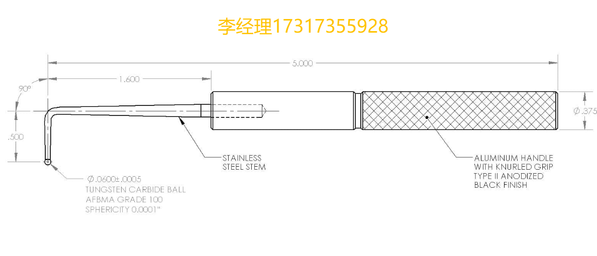 Carbide Probes SDSRA-0600-NISTCERT硬质合金探针测头,直角钩式 – 碳化钨球直径Ø.0600″ ±0.0005″,锥形杆,90° 弯曲 X .500″ 长度,带有Ø.375″ 直径的铝手柄,总长度5.00″