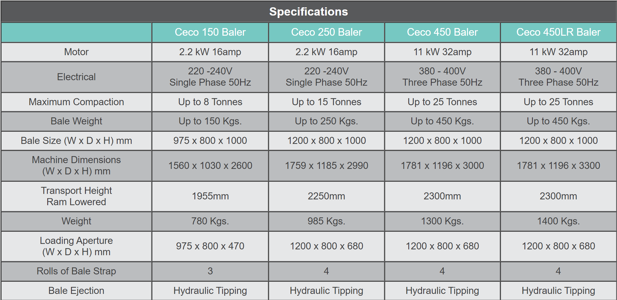 Ceco 150、Ceco 250、Ceco 450及Ceco 450LR型打包机规格参数: