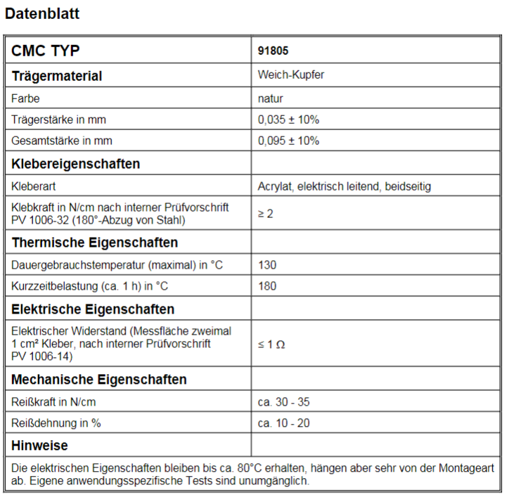 您将收到由CMC提供的金属胶带:铜质胶带、铝质胶带。这些胶带可用于电气连接、作为导热材料,或用作防气体的屏障。这些金属胶带有带导电胶层的,也有不带导电胶层的。此外,还可以根据需求定制各种规格的胶带产品(例如钢膜胶带)。
