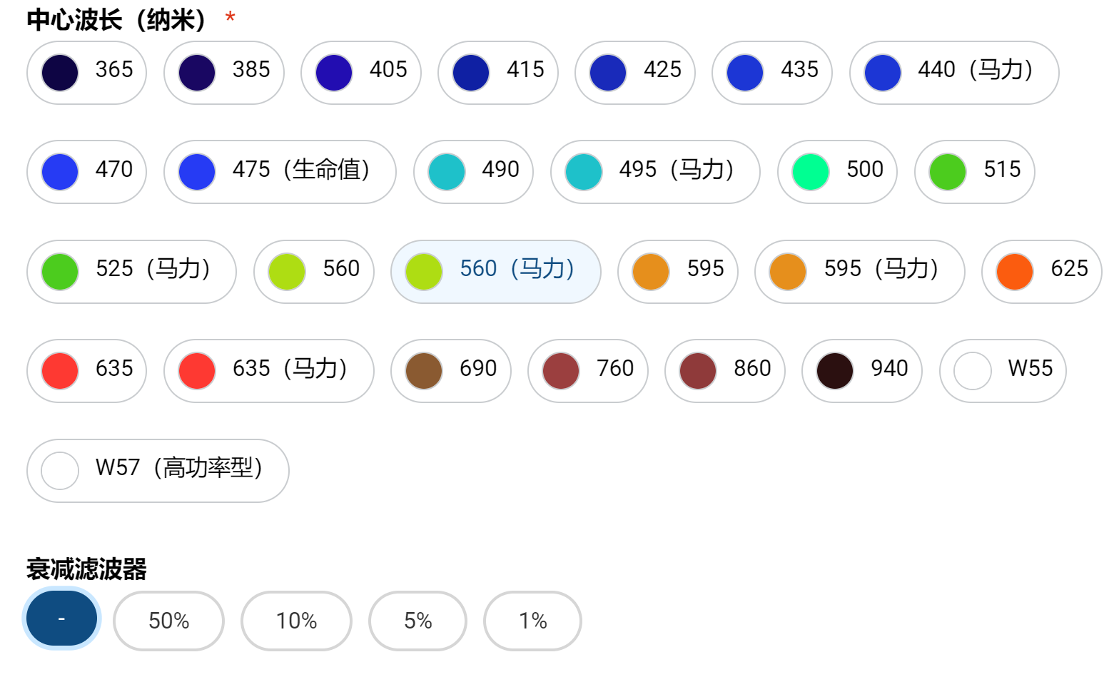 新型的多里克连接器式LED将高亮度LED与符合FC连接器标准的光纤跳线相连接。其散热设计也得到了改进,从而实现了更优的性能:风扇噪音更低,光线输出也更稳定。新的外壳可安装滤光片。这些滤光片可以是衰减型滤光片,用于降低光强;也可以是带通型滤光片,用于缩小光源的光谱带宽(适用于光度测量等应用)。