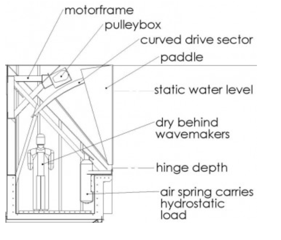 系统由一组翻板波浪发生器组成,每个翻板为楔形玻璃纤维(GRP)或不锈钢桨板,桨板在楔形端的铰链处枢转。翻板采用干背设计,并用滚动织物折角密封,运动仅在桨板前方水中产生波浪。每个桨板由电动伺服电机驱动,通过皮带传动,皮带沿附于桨板顶部的曲线扇形运行。弹簧或气动装置用以平衡静水力。力传感器检测造波力,编码器测量桨板位置。
