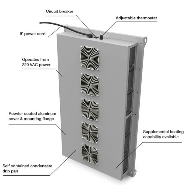 EIC 的 5500 BTU 热电空调机组设计用于在各种环境中冷却您的电子和电气控制、仪器、计算机终端、打印机、电信设备、监控设备、相机、激光和光学设备以及许多其他电子设备。我们的热电冷却系统设计用于各种外壳和运输箱。型号可用于室内和室外。冷却器采用耐腐蚀粉末涂层铝结构。所有产品都提供多种选项。