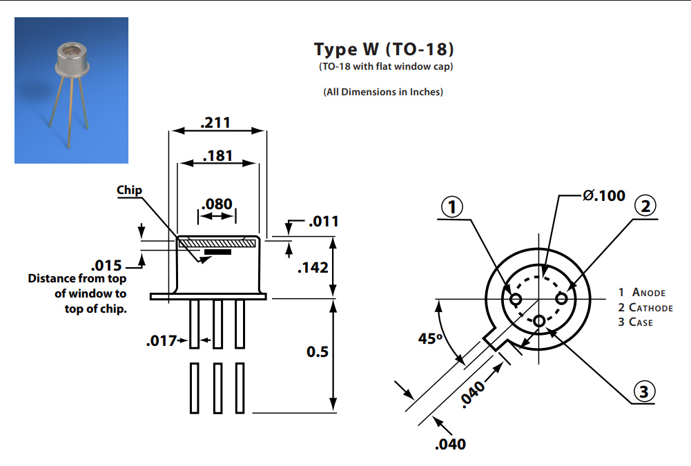 高速、低暗电流、低电容光电二极管用于高速通信系统。光敏区域直径为80 µm。平面钝化器件结构。