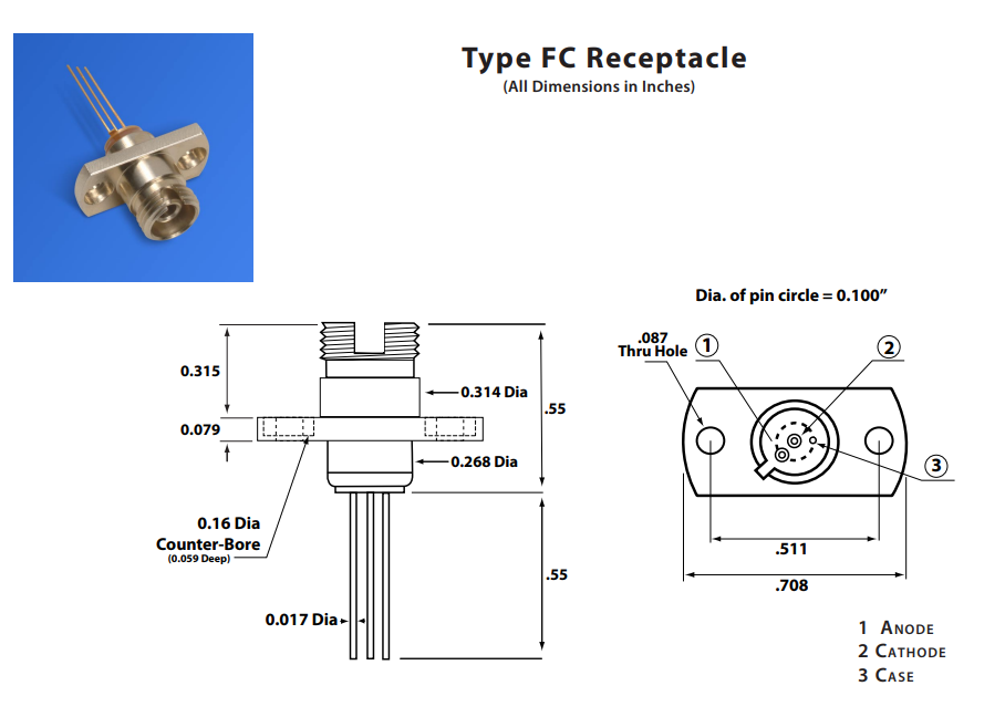 80 µm 活性直径 InGaAs 光电二极管,带聚焦透镜,TO46 头部,FC 接头插座对准,带 2 孔法兰