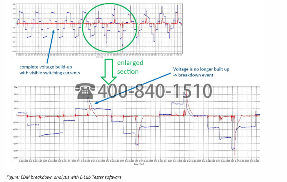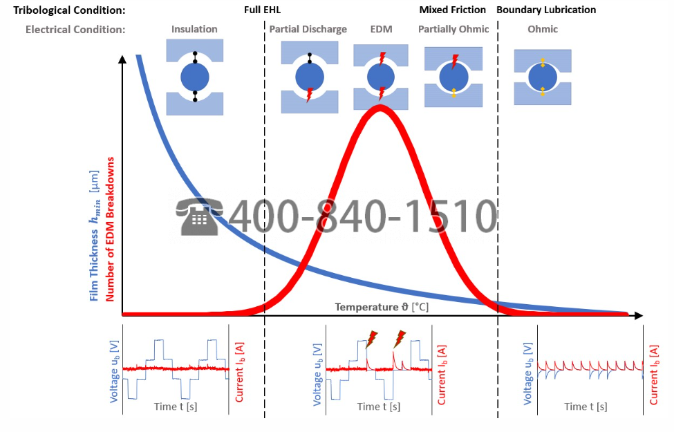 图:润滑条件和滚动轴承中的EDM放电频率 [“How Shaft Voltage Causes Bearing And Lubricant Degradation”; Hausner, Simon; 在2024年明尼阿波利斯STLE年会上介绍flucon的双重方法]