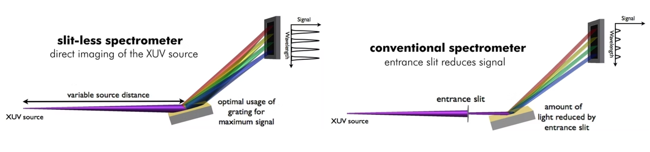easyLIGHT XUV 提供具有前所未有效率的宽带光谱测量。无狭缝设计可直接成像辐射光源,从而省去了繁琐的入射狭缝。30–250 nm 的光谱范围可方便覆盖高次谐波(HHG)和等离子体诊断的多种应用。由于采用法线入射设计,与掠入射光谱仪相比,easyLIGHT XUV 安装和对准更为简便。