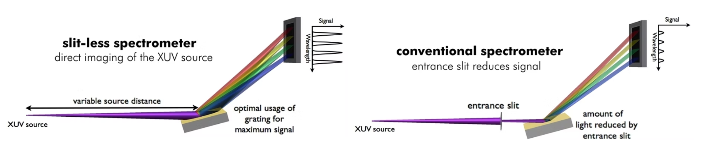 maxLIGHT 采用专有的无狭缝设计,可实现业内最高的光收集效率与整体效率。经过像差校正的平场波长覆盖范围为 1 nm 至 200 nm,并可实现较宽的单光栅光谱带宽,例如 每个光栅可覆盖 5–80 nm
