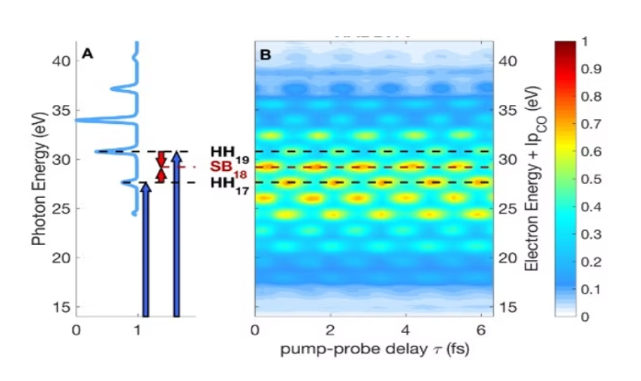 高次谐波源自单光子跃迁(蓝色箭头);而 XUV 与红外(IR)光的双光子跃迁会在光电子能谱中产生旁带(右图)。