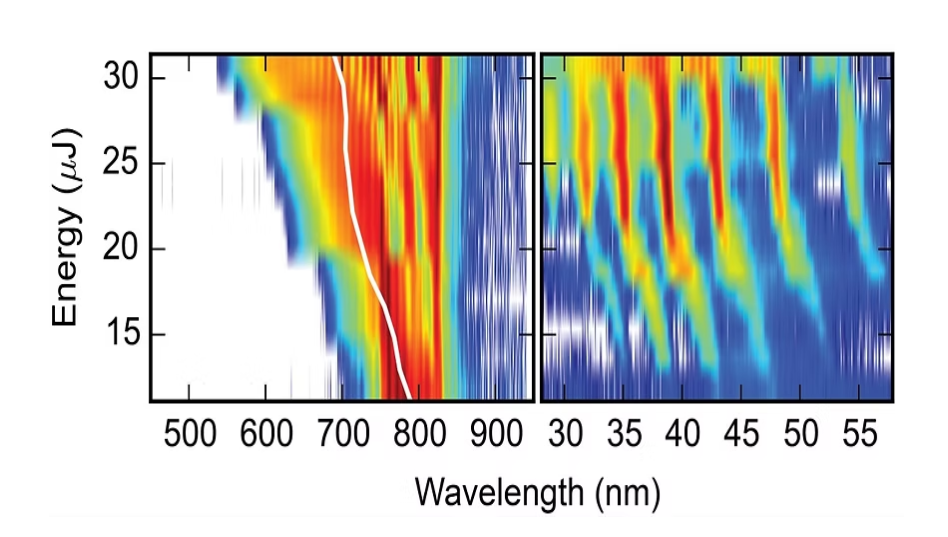 右图为 maxLIGHT XUV 测得的 HHG 光谱;左图为在 Kagome-PCF 中展宽后的 25 fs 基频脉冲光谱