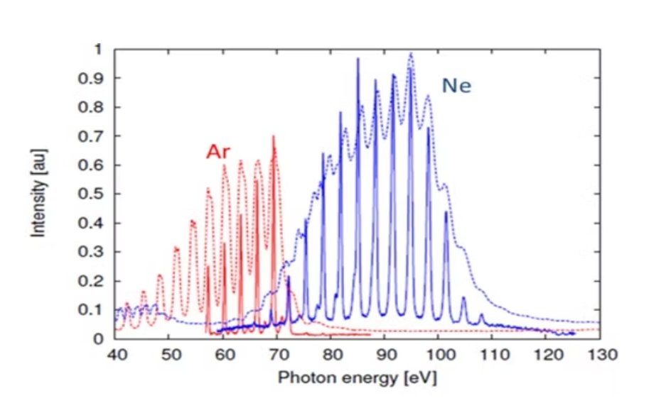 随着泵浦能量的增加,**孤子自频移(向蓝移)**对 HHG 的影响清晰可见。