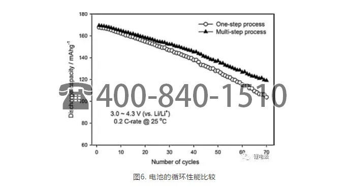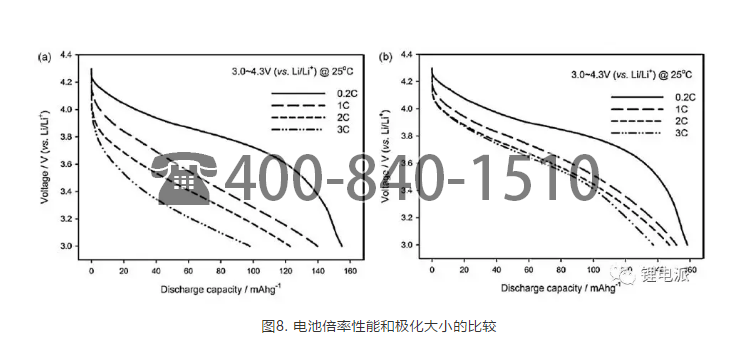 其中,a为一步法做的电池,b为多步法做的电池,两种电池都是在0.2C的条件下恒流充电。a图显示随着放电电流增大,电池极化不断增加,反观多步法的电池放电曲线图,虽然电池极化也有一定增加,但是跟a图相比则极化比较小。出现这种现象的原因还是得追溯到浆料的制备工艺上,正如之前所说的,多步法的混料工艺能够保证导电剂、活物质均匀的分散开,构成一个稳定均一的导电网络,从而活物质和导电剂的接触电阻大大降低,以保证了电池优异的循环性能。
