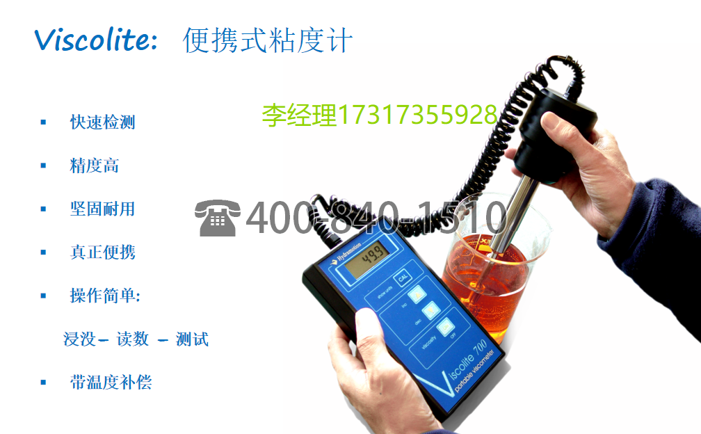 浸入即读, 使用XL7-100B便携式粘度计只需要这么简单。无需设置或取样。只需将坚固的不锈钢传感器浸入液体中,即可立即获得粘度和温度测量值。无论液体容量多少,只需浸入传感器尖端 – 然后读取即可。
