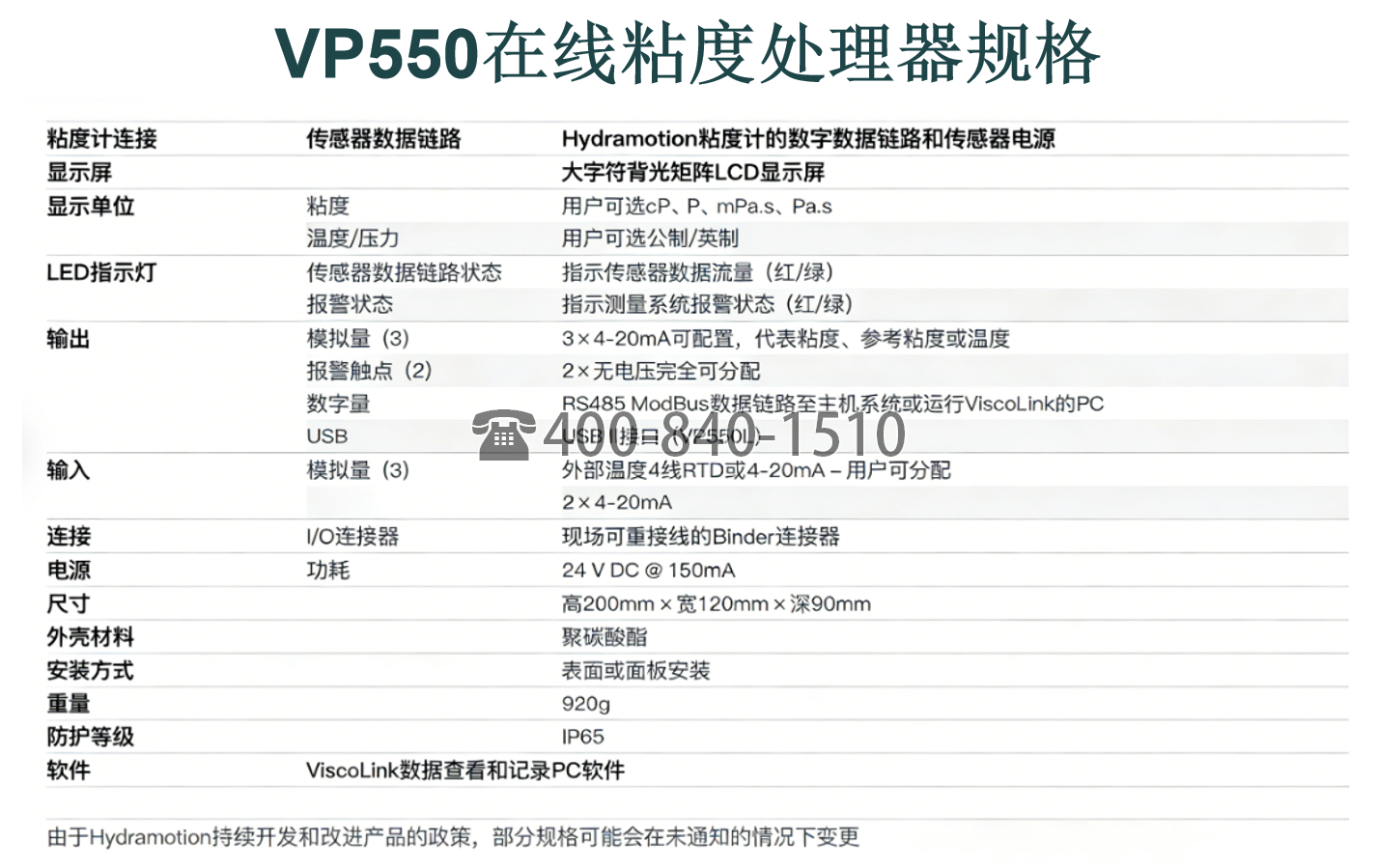 以下是VP550在线粘度计处理器的规格,可以参考图片中的数据进行合适的选择。