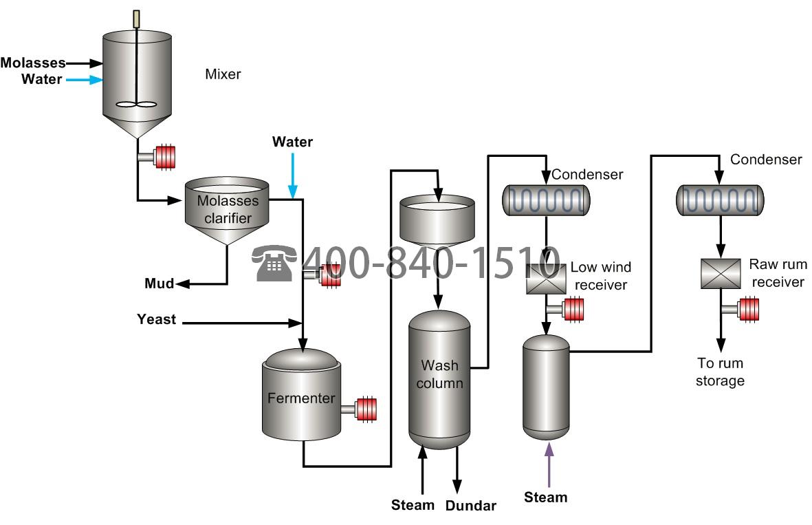 在整个过程中,折光仪被用于测量和控制糖蜜稀释,含有dunder和水,强度约为47Brix,还用于监控和控制发酵罐。