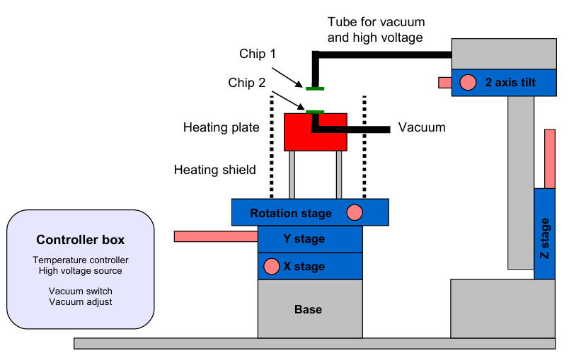 下层芯片通过基板固定,上层芯片由真空吸针持握,两套真空夹具均可独立调节与启停。为执行阳极键合工艺,设备集成加热板与高压电源,可通过控制单元同步调节键合电压并实时监测电压-电流参数,加热板温度亦由该单元统一控制。