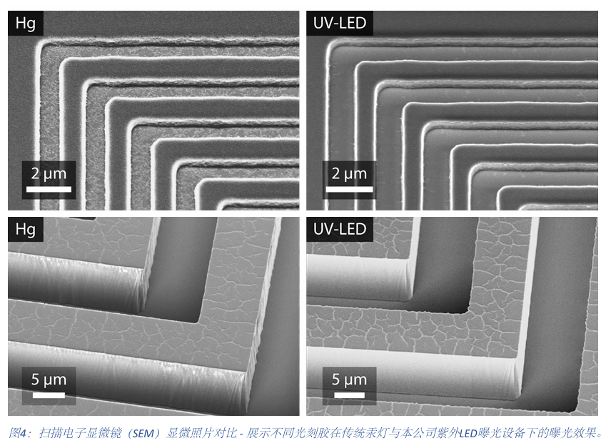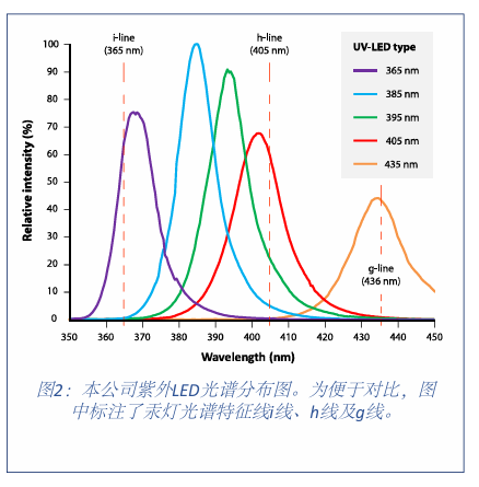 我们的UV-EXP曝光系统集成高功率发光二极管(LED)来产生紫外光。与传统系统中使用的汞灯相比,LED具有诸多优势,正推动全行业的技术转型。下表重点列出了LED技术的主要特性,而图2则介绍了紫外光刻所需的4种关键波长光谱分布。