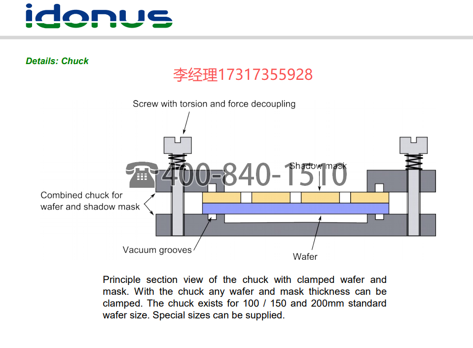 通过荫罩进行薄膜沉积是 PVD 层结构化的强大工艺。它可以通过在沉积过程中对基材进行精确掩模来取代一项光刻和一项蚀刻步骤。该工艺的一个基本问题是荫罩和晶圆的对准和临时固定。 Idonus 提供了一种系统,可通过集成抗振夹盘对荫罩和晶圆进行精确且可重复的对准。借助显微镜证明了 6 µm 的对准公差。卡盘可直接插入真空室进行PVD。沉积后,打开卡盘,分离晶片和掩模,而不会损坏晶片。荫罩可以重复使用。可提供适用于任何基材尺寸的沉积卡盘,并可根据您的要求进行调整。Idonus还提供由金属、硅、玻璃或陶瓷等各种材料制成的精确且具有成本效益的荫罩。