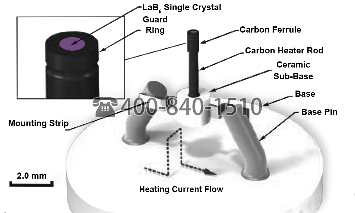 裸露的发射极表面直径范围为 10 μm 至 250 μm,标准直径为 25 μm。单晶 LaB6<100> 方向,安装在单件式无应力碳加热器棒的末端,并由碳套圈固定到位。附加的保护环孔径结构控制 LaB 的曝光6表面。