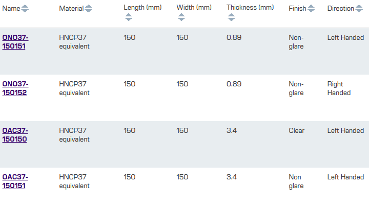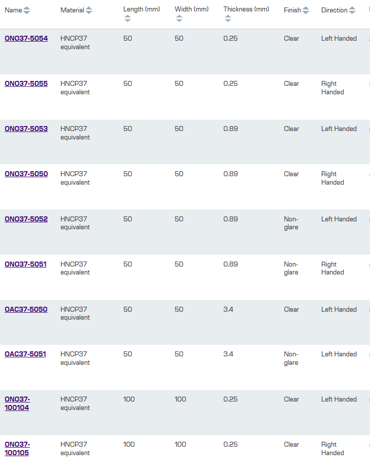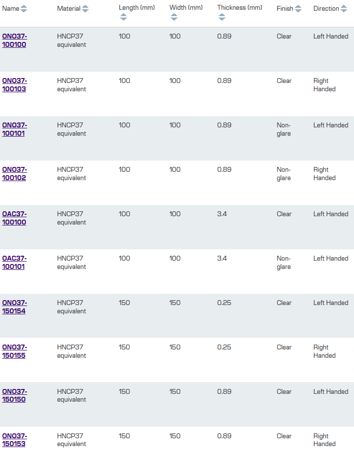 Knight Optical 现货提供 HNCP37 材料的替代品,表面可选防眩光或标准透明处理,并提供左旋和右旋两种版本。