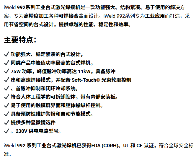 iWeld 992系列工业台式激光焊接机是一款紧凑易用、功能强大的高精度焊接设备,专为各种可焊接合金的工业加工设计。其主要特点包括:采用节省空间的台式设计,功率高达75W且峰值脉冲功率达11kW,支持脉冲串和高速焊接模式,配备Soft-Touch®光束轮廓控制、首脉冲抑制和闭环冷却系统。设备具有符合人体工程学的可拆卸腔体、触摸屏界面与腔体操纵杆控制,并具备维护警报和节能模式。该系列已通过FDA、UL和CE认证,符合全球安全标准。