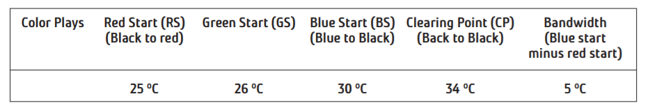 公差:变色开始温度±2ºC;变色温度带宽±2ºC