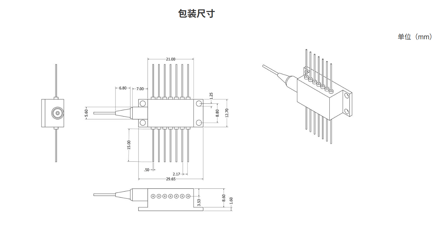 该激光器采用 14 引脚标准蝶形封装,带有监控光电二极管和热电冷却器 (TEC)。