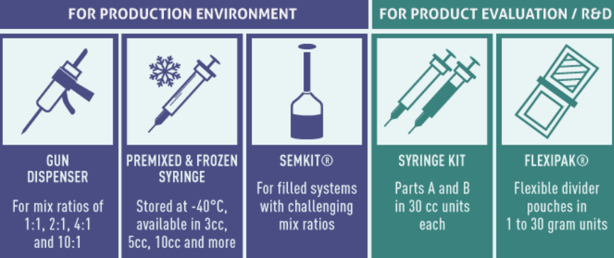 Master Bond 双组分环氧提供多种便捷包装形式(如胶枪涂敷器、预混冷冻注射器、Semkits®、注射器套件、FlexiPaks® 等),这些包装可简化或省去混合步骤,让应用流程更简便。