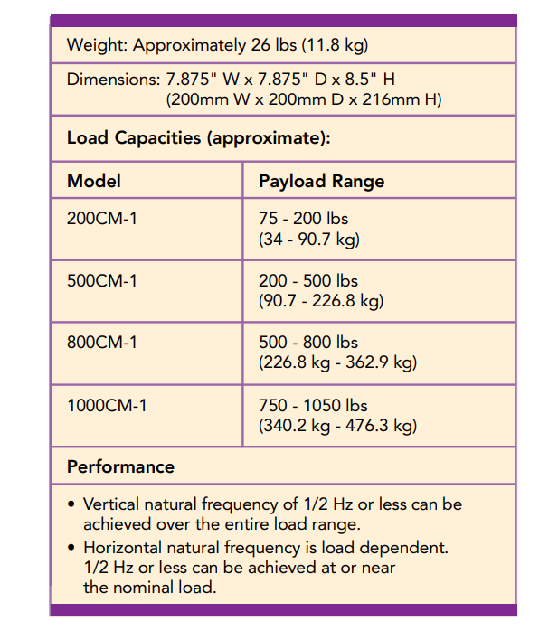 CM-1 低频减震器,适用于50至1050磅的重量负载,并在1/2 Hz频率下垂直和水平性能。