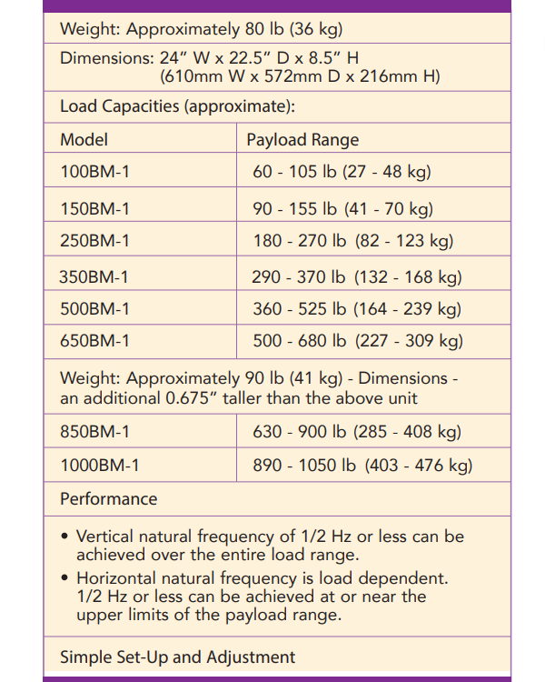 Minus K Technology BA-1 最高容量的台式隔离器。一种具有成本效益的产品,适用于重量高达1000磅和1/2 Hz性能的垂直和水平应用。