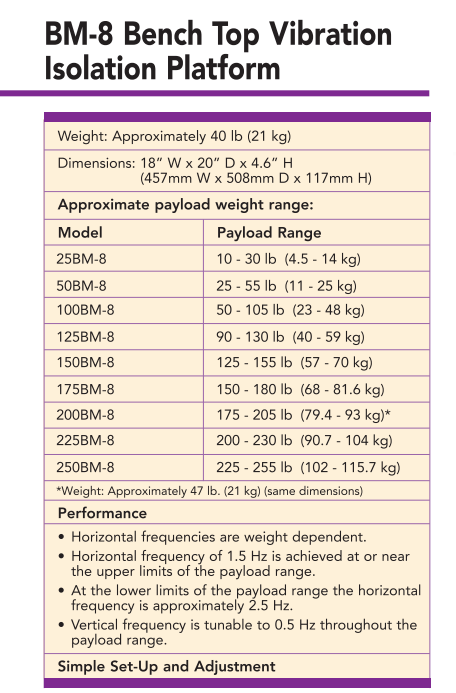 BM-8台式平台提供了比全尺寸空气桌好10-100倍的性能,且仅高4.6英寸,无需空气或电力!