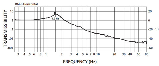 下图展示了 BM-8 在垂直方向上 0.5 Hz 的性能表现。BM-8 仅以 4.6 英寸(约 11.7 厘米)的高度,就能提供与我们更大尺寸隔振器同等的高性能。BM-8 的水平方向性能与 BM-6 相同。