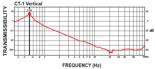 下图中的 Minus K 曲线适用于任何 Minus K 0.5 Hz 系统(无论是水平方向还是垂直方向)。部分 Minus K 台式产品的实测传递率曲线也展示如下: