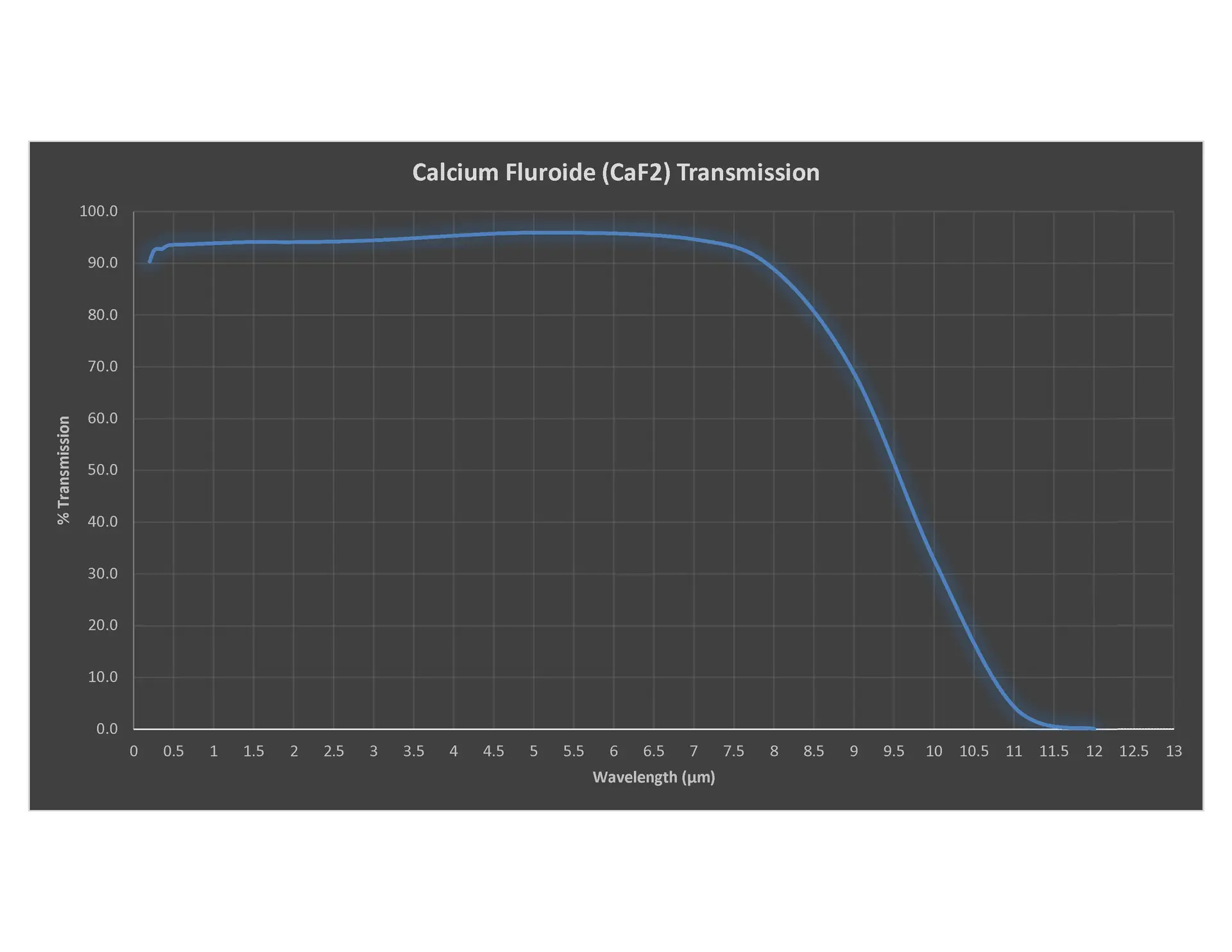氟化钙(CaF₂)在光学领域可用作窗口片、棱镜和透镜,能传输从真空紫外(VUV)到红外范围的光。它是一种物理和化学性质稳定的光学材料,具有良好的耐水性和耐化学腐蚀性。其生产有两种品质,一种用于可见光和红外应用,另一种专门用于紫外应用。用于紫外应用的氟化钙由化学纯粉末生长而成。