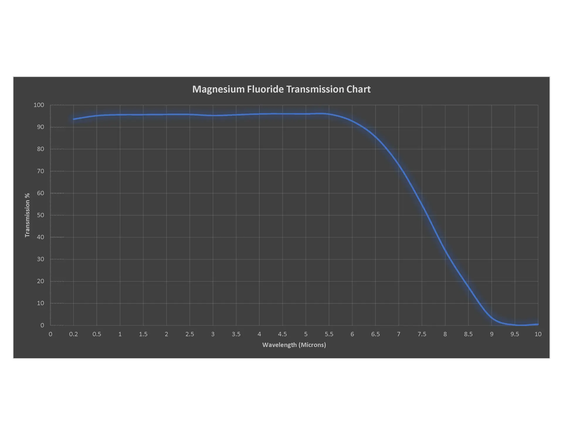 氟化镁(MgF₂)采用真空斯托克巴杰法生长,可制成多种直径。氟化镁质地坚固,抛光效果极佳。它具有轻微的双折射性,通常供应的产品其光轴切割方向与窗口表面垂直。氟化镁是一种水溶性材料,在真空紫外(VUV)区域具有良好的透光性,是准分子激光应用的理想选择。它是能在 121 纳米(莱曼 α)真空紫外波段透光的两种材料之一。