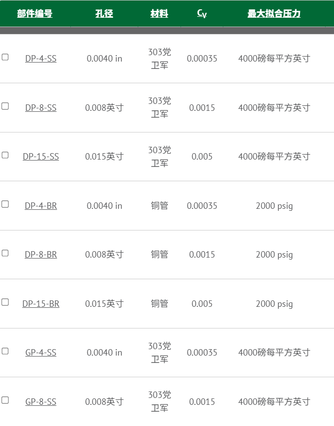 径尺寸从0.004英寸到0.020英寸不等。一般来说,大型仪器腔室需要大型流动孔。粘性流体需要比低粘度流体更大的流动孔口。更多