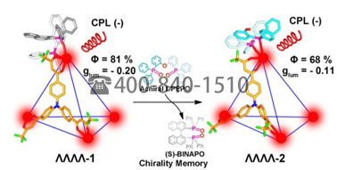 具有圆偏振发光(CPL)性质的手性镧系元素笼在对映体选择性客体识别和传感中具有潜在的应用。然而,鉴于Ln(III)离子的不稳定性,开发一种简单而可靠的方法用于同型手性镧系元素笼的非对映选择性组装仍然是一个巨大的挑战。近日,黑龙江Pengfei Yan,Hongfeng Li等报道了通过手性辅助配体诱导策略形成对映纯镧系四面体笼的第一个例子。合成的[(Eu4L4)(R/S-BINAPO)4]笼是由四个非手性C3对称的[4,4′,4”-tri(4,4,4-trifluoro-1,3-dioxobutyl)triphenylamine, L)]为面,四个Eu(III)离子为顶点,和四个手性R/S-bis(diphenylphosphoryl)-1,1′-binaphthyl (R/S-BINAPO)作为辅助配体组成。作者通过X射线晶体学,NMR和CD光谱对对映纯的手性拓扑四面体笼(Eu4L4)(R-BINAPO)4的(Eu4L4)(S-BINAPO)4 (ΔΔΔΔ-1和ΛΛΛΛ-1)进行了表征。实验发现,该四面体笼具有强的CPL,|glum|高达0.20,且量子产率(QYs)高达81%,这是手性Ln(III)配合物中报道的最高值。此外,作者还首次观察到基于镧系元素的组装的手性记忆效应。当R/S-BINAPO被非手性bis[2-(diphenylphosphino)phenyl](DPEPO)取代后,该笼的手性可以保留,得到了另一对对映纯Eu(III)四面体笼型ΔΔΔΔ-和ΛΛΛΛ-[(Eu4L4)(DPEPO)4] (ΔΔΔΔ-2和ΛΛΛΛ-2)。令人意外的是,ΔΔΔΔ-2和ΛΛΛΛ-2具有高的发光量子产率(QYs = 68%)和强的CPL(|glum| = 0.10)。该工作为制备具有CPL性质的镧系元素笼提供了一种简单且低成本的合成策略。